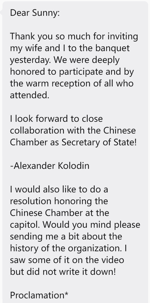 【本报讯】亚利桑那州政界人士、州务卿候选人Alexander Kolodin周六晚在出席亚省中华商会春宴后,第一时间向主办方发来感谢信,对活动的成功举办及华人社区的热情接待表示高度赞赏,并表达未来加强合作的意愿。