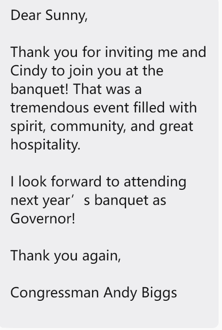 【本报讯】美国国会议员Andy Biggs周六晚出席亚省中华商会春宴后,特向本次宴会主席,同时担任亚省中华商会副会长的Sunny Kong发出感谢信,对活动的成功举办及华人社区的热情接待表示赞赏,并在信中流露出竞选州长的意向。