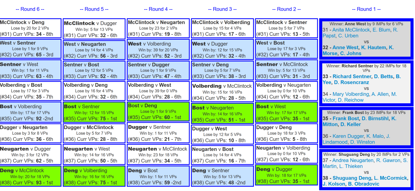 第五轮双方各自战胜对手,比分战至75比75。最后一轮,本队迎战经验丰富、总大师分超过8000分的头号种子McClintock队。本队在本桌8副牌中有7副取得正分,筑起一道稳固的“得分墙”,最终以32比12取胜,斩获18VP。赛后,全队焦急等待Bost队对阵Volberding队的结果。最终,Bost队仅获得17VP,总分92VP,以1VP之差屈居亚军。