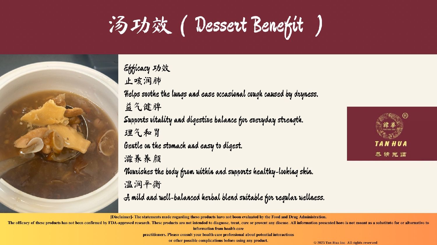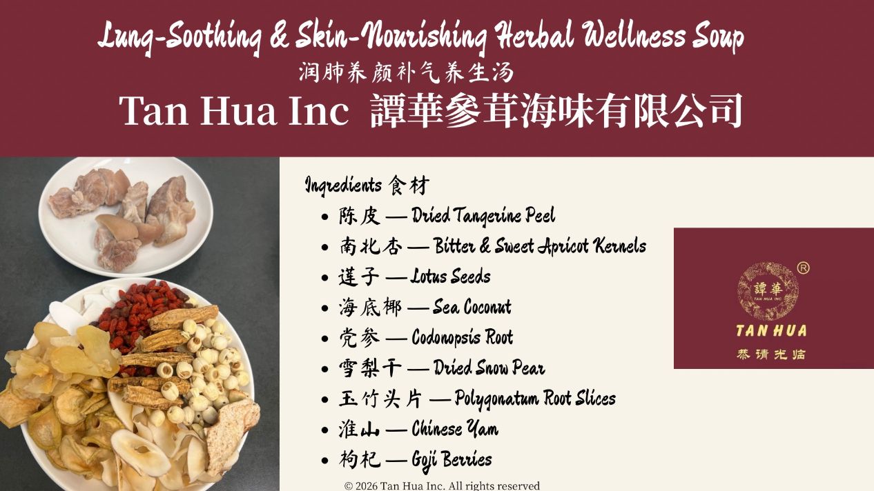 Another focal point of the gathering was the Lung-Soothing, Qi-Boosting Herbal Wellness Soup, prepared according to traditional Chinese dietary therapy principles. The soup features a carefully balanced combination of ingredients, including dried tangerine peel, bitter and sweet apricot kernels, lotus seeds, sea coconut, codonopsis root, dried snow pear, polygonatum root, Chinese yam, and goji berries. It is slow-simmered for over three hours.
