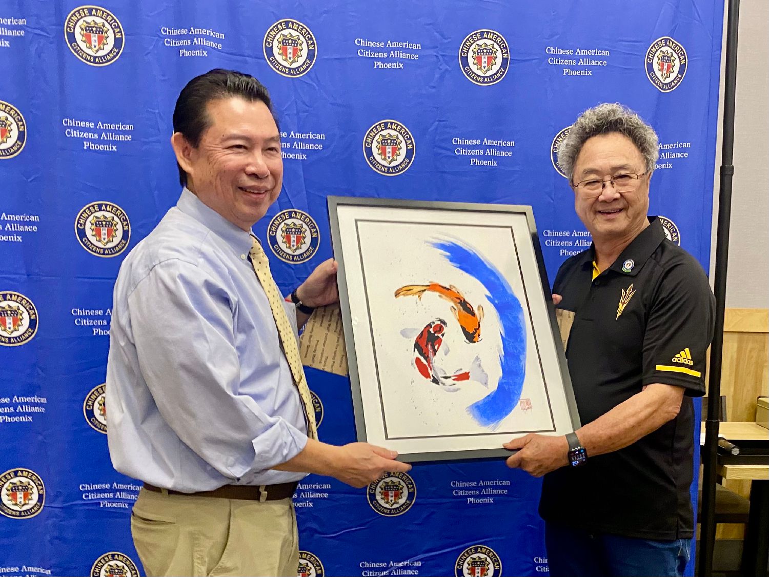In honor of National President Ken Hui’s visit to the Phoenix C.A.C.A. installation, Ken was awarded a special Koi Painting by C.A.CA. members John Tang and a Arcosanti bronze bell by Meng Ansley.